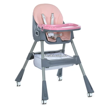 Стульчик для кормления M 5722 Pink оборудован колесики для удобного перемещения по комнате, внизу он оснащен специальной корзинкой для игрушек, эта модель имеет высокую спинку с регулируемым наклоном, также у стульчика регулируется подножка.