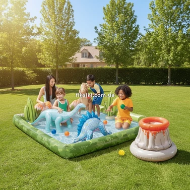 Игровой центр Intex 56132 привлекает внимание ярким и красочным дизайном, дополненным надувными фигурками динозавров, которые создают атмосферу настоящего доисторического парка, а встроенный фонтан, подключаемый к обычному садовому шлангу, добавляет динамики и делает игру еще более захватывающей в жаркие дни.