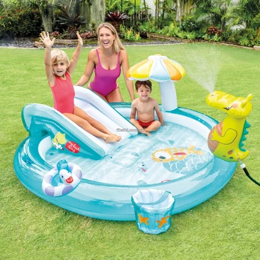Надувной игровой центр Intex 57165 - оснащен горкой и веселым фонтаном, что делает каждую игру более захватывающей и разнообразной. Ребенок сможет весело скатываться с горки, играть с водой и приглашать друзей для совместных развлечений, развивая ловкость и воображение в безопасной и комфортной среде. Такой центр легко устанавливать и использовать, он быстро надувается и так же просто складывается для хранения.